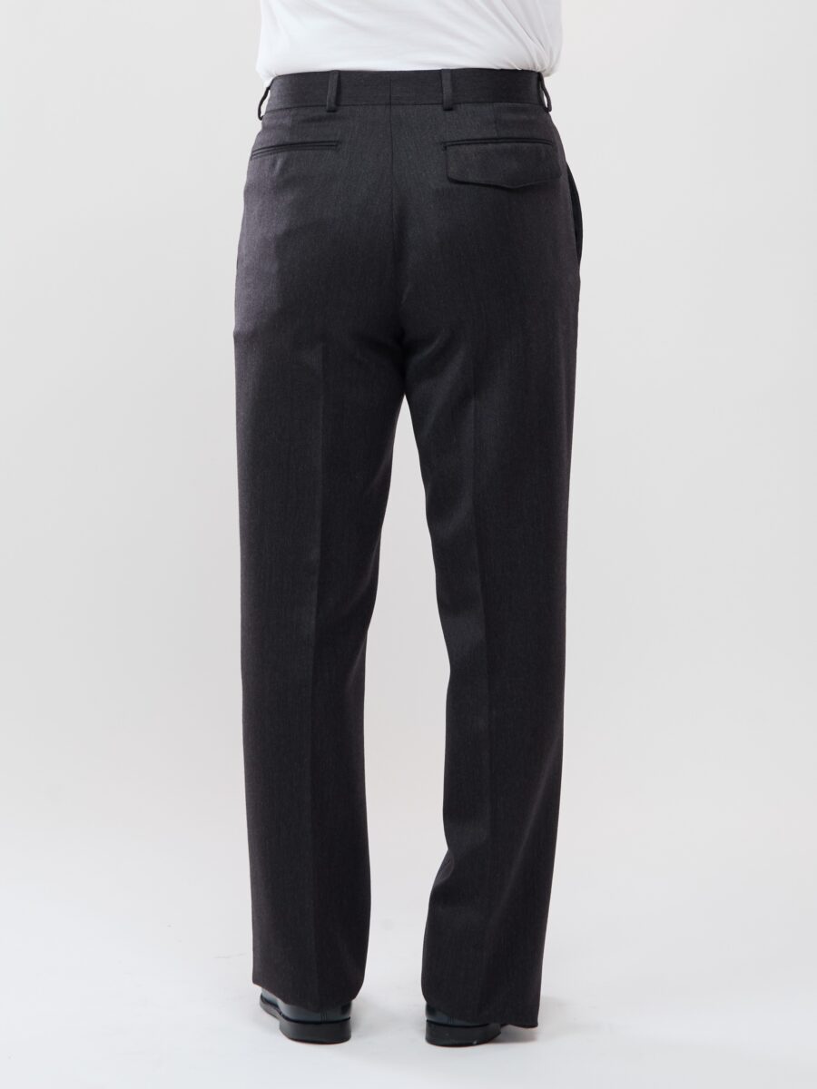・イタリアンポケット(サイド)×2 ・後ろポケットは両玉縁仕様 ×2(右側にトップステッチ入りフラップ付き) ・V字型の先端で仕上げたウエストバンド延長タブ(ボタン留め) ・フロントにウォッチポケットなし ・裾幅25cm